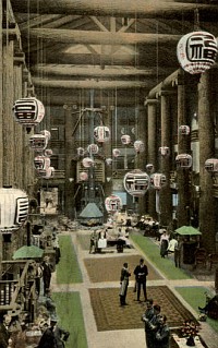 above, the lobby of the Forestry Building built for the 1905 Lewis & Clark Centennial Exposition. This structure, which was located near Portland OR and burned in 1964, served as the model for the Glacier Park Lodge. A 1916 image of the Glacier Park Lodge lobby is shown below.