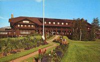 Today's visual of the Glacier Park Lodge exterior is noticeably different from years past. In the early days it rose starkly from the mountain plains; today it is framed by large evergreens. The photo above was taken during the 1960s, what we'll call "middle age" for this grand lodge, and you'll note that the trees were just beginning to make their mark. Compare this to the first large photo on this web page, reproduced immediately below: